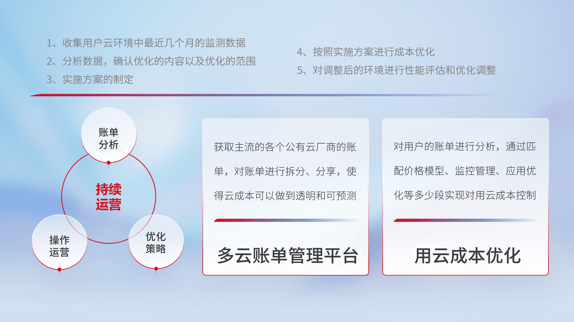 通过多云纳管,,以统一的资源数据模型把客户的云资源进行抽象和封装,,,进而实现对多云资源的统一操作,,保障云资源管理的可靠性、、、稳定性与可用性。。。。量身定制化运维内容,,,配置、、、、开发运维、、补丁管理、、、备份、、、、监控、、认证和访问管理、、、审计和日常巡检等,,,,保障在用云过程中的可靠度,,稳定度以及高可用率。。。。
