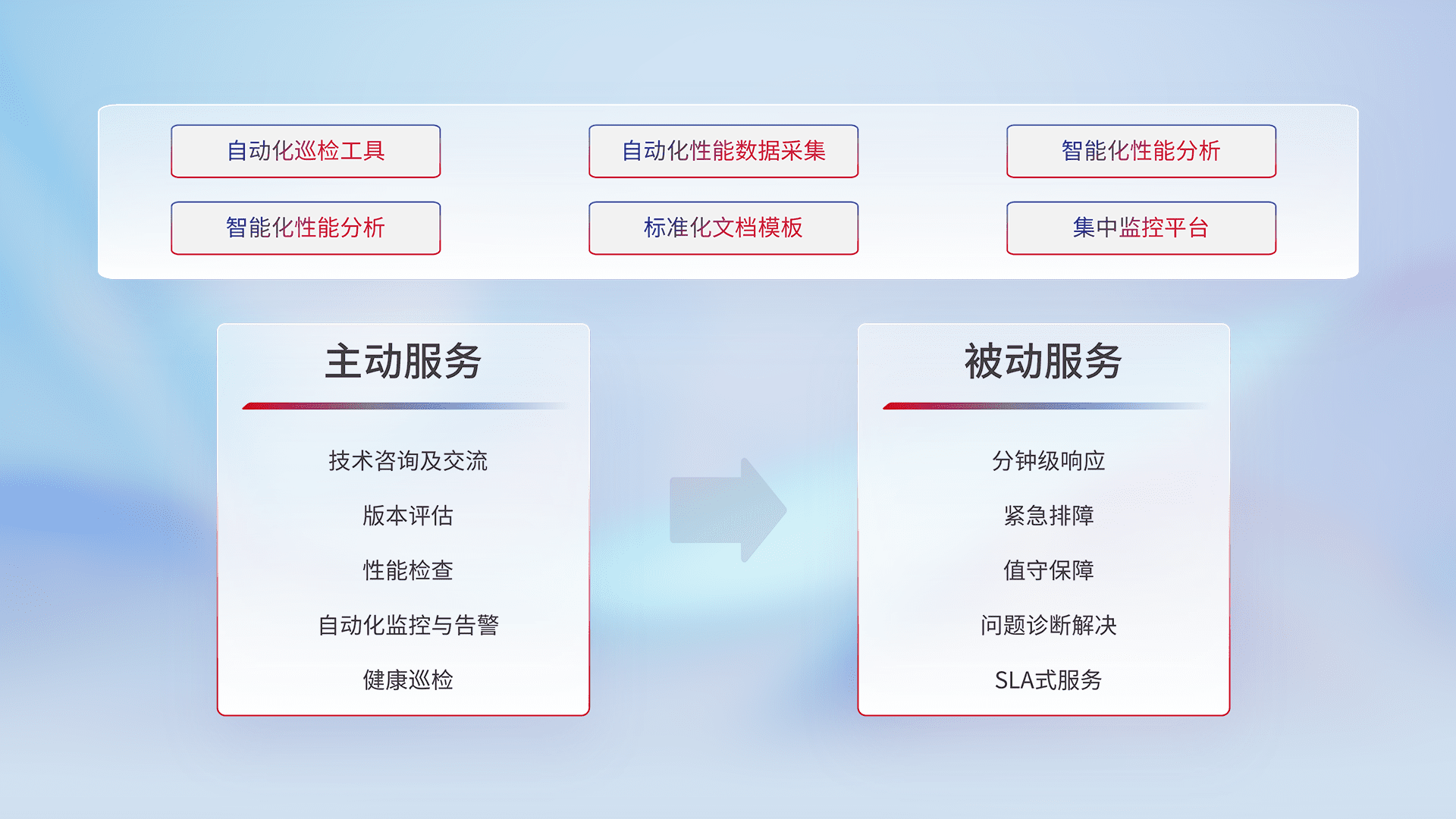 智能化工具和标准化文档,,,保障服务质量,,,,提供主动服务(包含技术咨询、、版本评估、、、、性能检查、、自动化监控与告警、、、健康巡检)和被动服务包含(分钟级响应、、紧急排障、、、值守保障、、、问题诊断解决、、、、SLA服务)。。。。