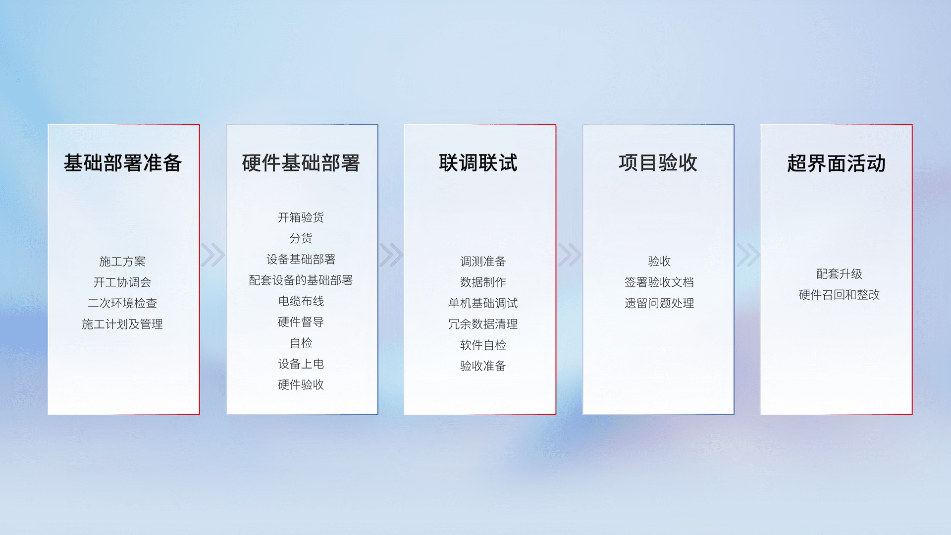 从基础部署准备、、、、硬件基础部署、、联调联试、、项目验收、、、越界面活动的全过程可追溯,,,保证施工质量和进度。。。。